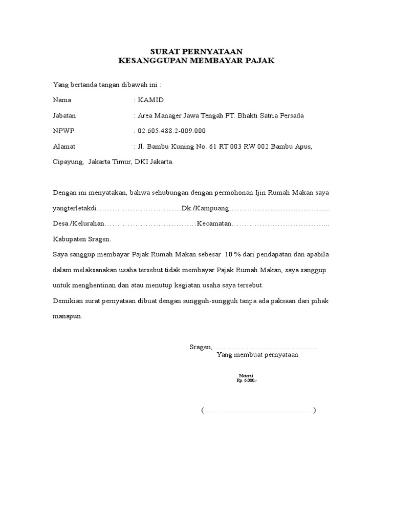 Contoh Surat Pernyataan Kesanggupan Membayar Pajak - Contoh Surat Pernyataan Pengertian Fungsi Jenis Cara Membuat : Agar kedua belah pihak saling percaya, sebaiknya anda membuat surat pernyataan kesanggupan membayar hutang dalam 2 rangkap namun tetap dengan tanda tangan.. Surat pernyataan jual beli digunakan untuk membuat perjanjian diantara kedua belah pihak yang akan melakukan transaksi. Pernyataan kesanggupan biasanya digunakan untuk mengikat seseorang atas pernyataannya yang menyanggupi beberapa hal tertentu kepada pihak biasanya, judul surat ini berisi jenis surat pernyataan yang ingin dibuat. Hal ini dikarenakan ada beberapa format yang harus dipenuhi. Contoh surat pernyataan kerja, kesanggupan, sikap, belum menikah, dan lainnya. Agar kedua belah pihak saling percaya, sebaiknya anda membuat surat pernyataan kesanggupan membayar hutang dalam 2 rangkap namun tetap dengan tanda tangan.